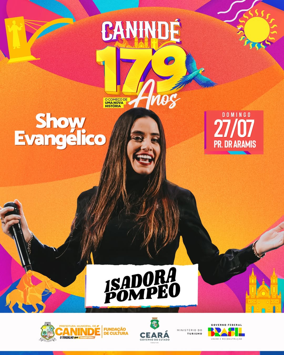 A celebração dos 179 anos de Canindé terá um momento especial de fé e louvor com a presença da cantora gospel Isadora Pompeo. O show evangélico está marcado para o domingo, 27 de julho, na Praça Dr. Aramis, e integra a programação oficial do aniversário do município.